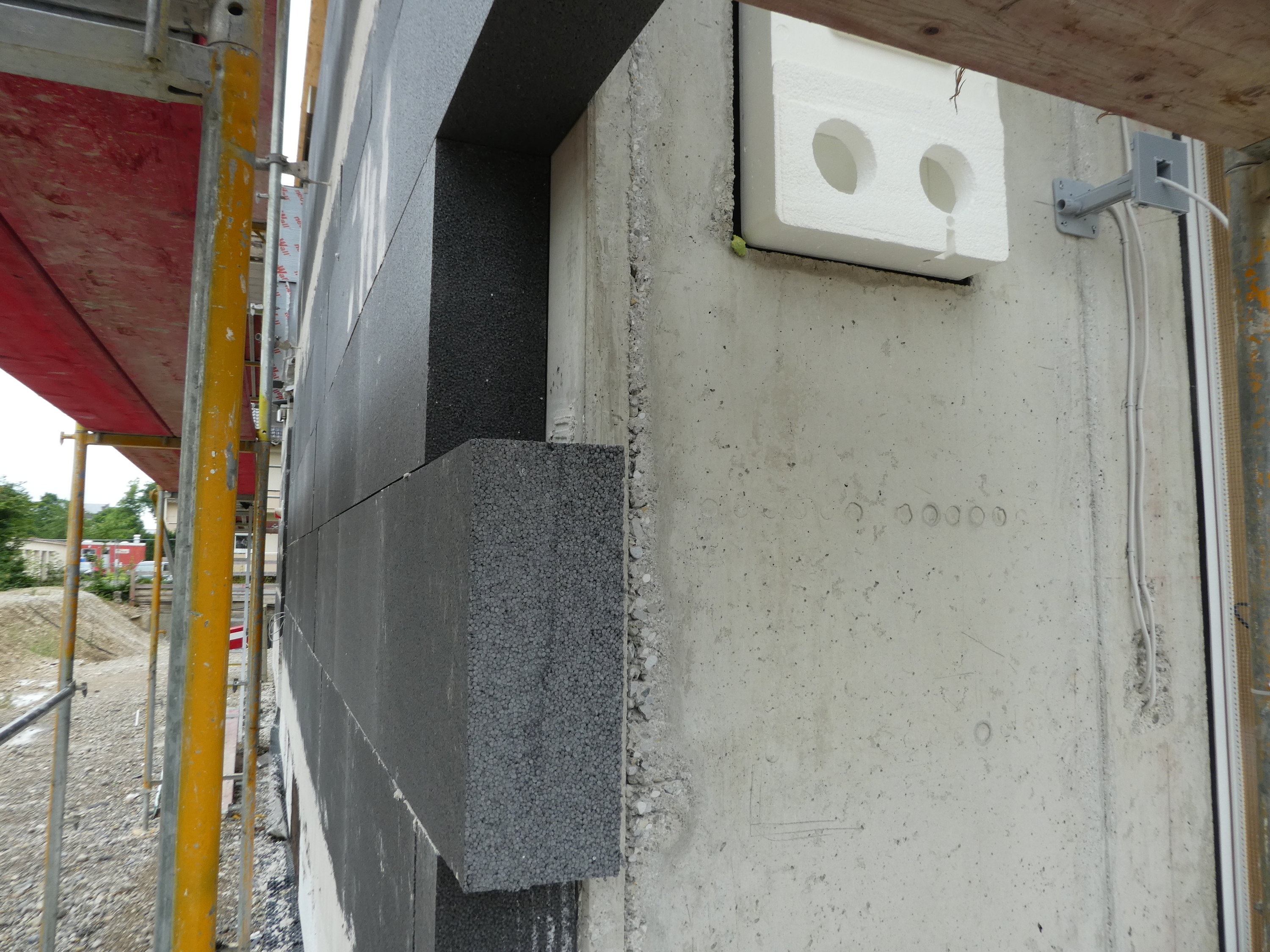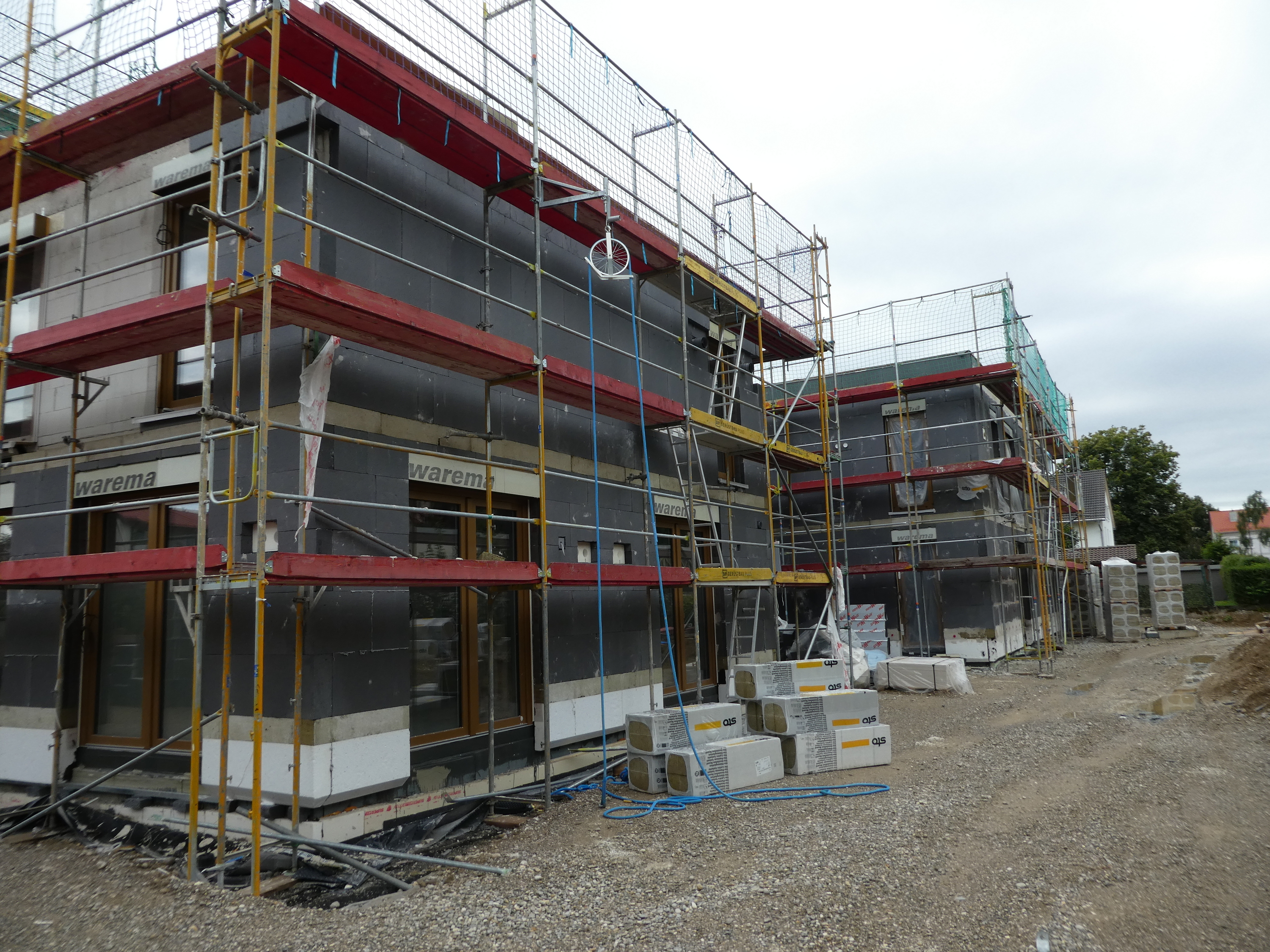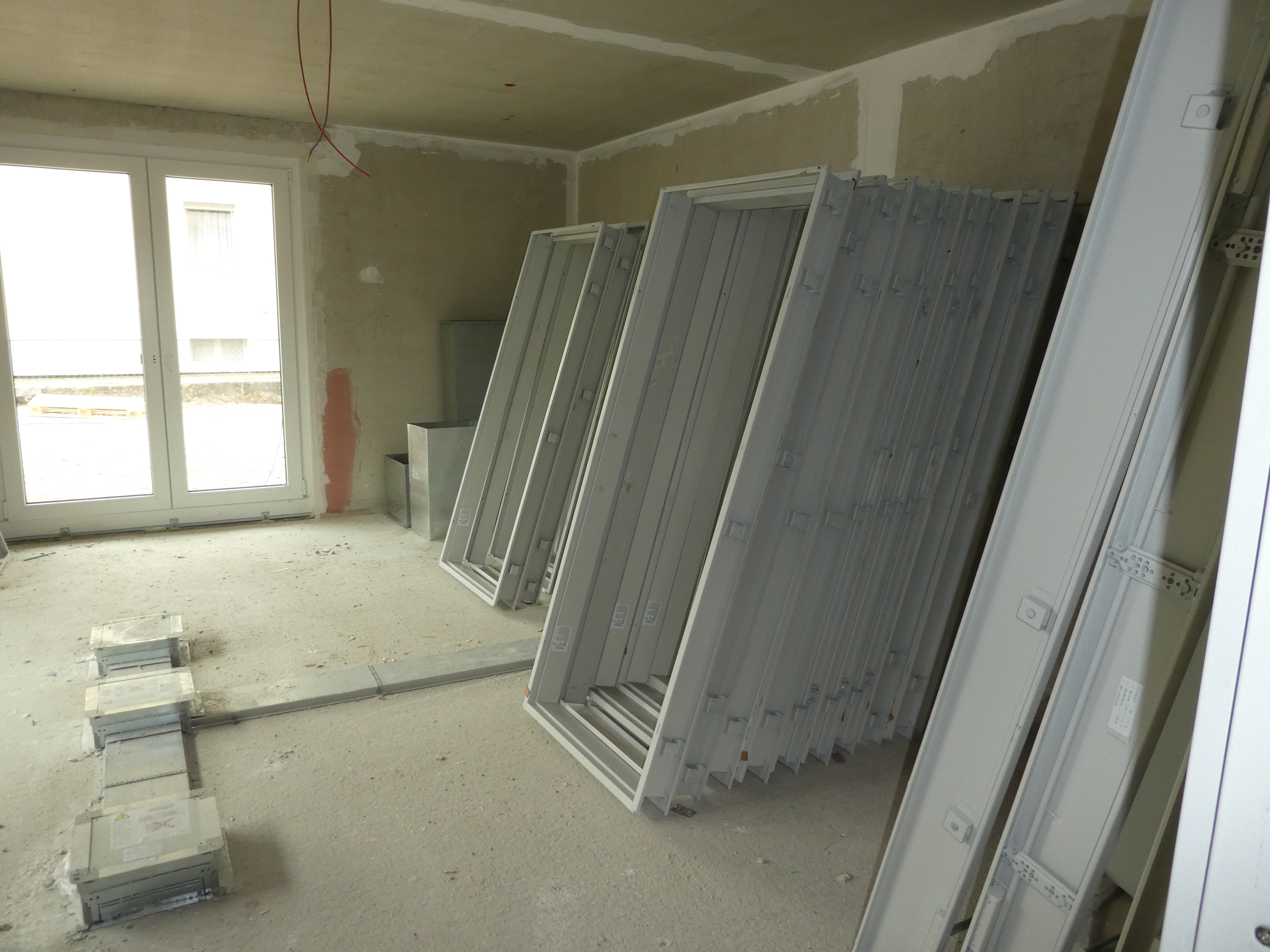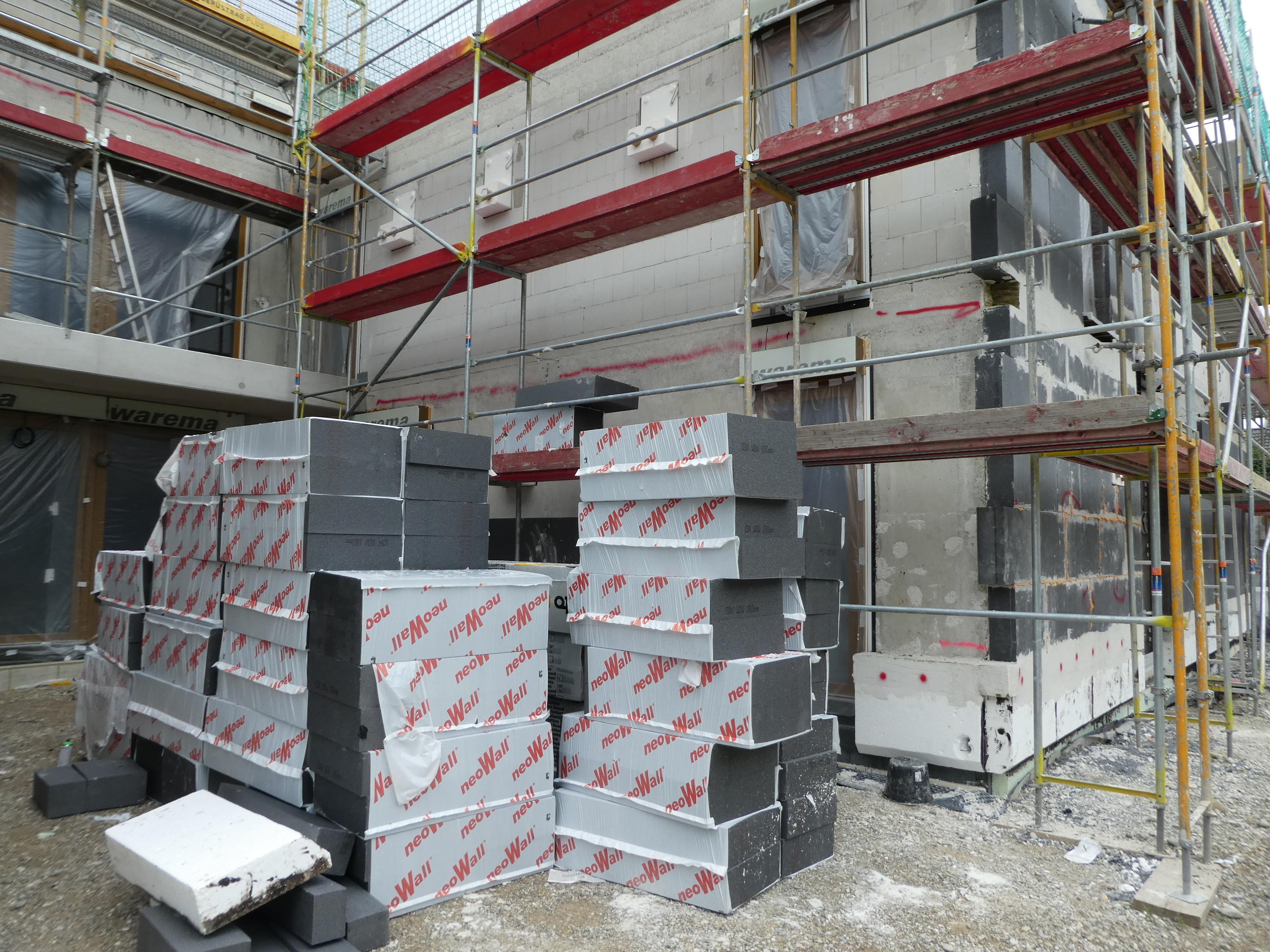 Das große Silo ist weg – die Innenputzarbeiten sind fertig! Dafür zeigen wahre Berge von Dämmplatten vor dem Gebäude an, dass es jetzt außen mit der Anbringung des Vollwärmeschutzes weitergeht – die Westfassade des Südflügels ist schon weitgehend fertiggestellt. Die Dacharbeiten auf dem Einfahrtsbauwerk der Tiefgarage sind abgeschlossen. Auch im Gebäude geht es mit dem Ausbau weiter: die Lüftungsanlage hat fast alle Räume erreicht, und eine große Anzahl von Türzargen ist montiert.