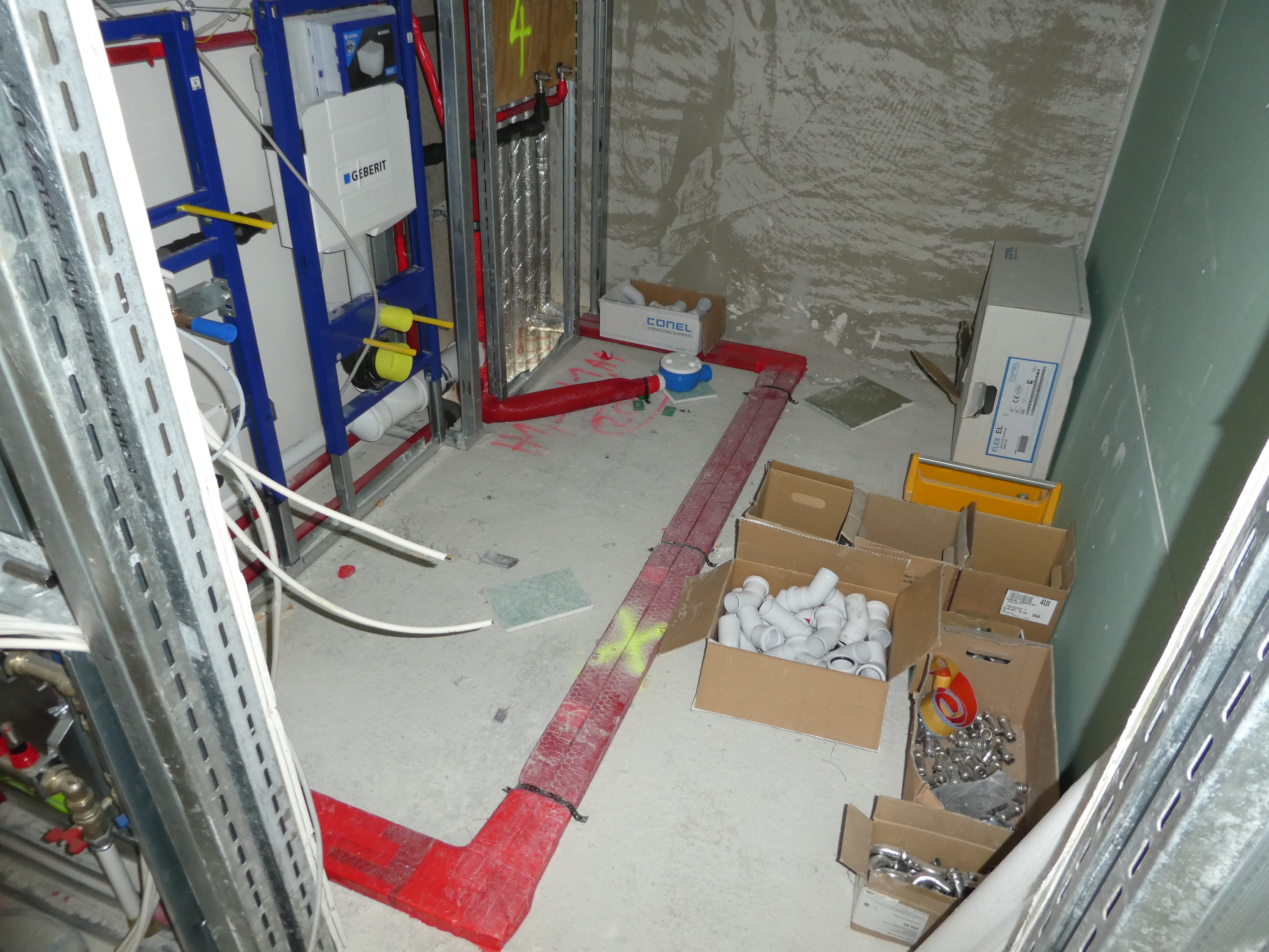 In unserem Objekt wird derzeit 7 Tage die Woche gearbeitet! Dafür gibt es einen zwingenden Grund: in 2 Wochen soll mit der Einbringung des Estrichs begonnen werden, und das ist nur möglich, wenn vorher die Sanitärinstallation fertiggestellt ist und die Trockenbauwände komplett beplankt sind. Und die Fußbodenheizung muss natürlich auch noch verlegt werden. Verständlich, dass alle Beteiligten in diesen Tagen ihr Möglichstes tun, um ihre Fertigstellungstermine einzuhalten.