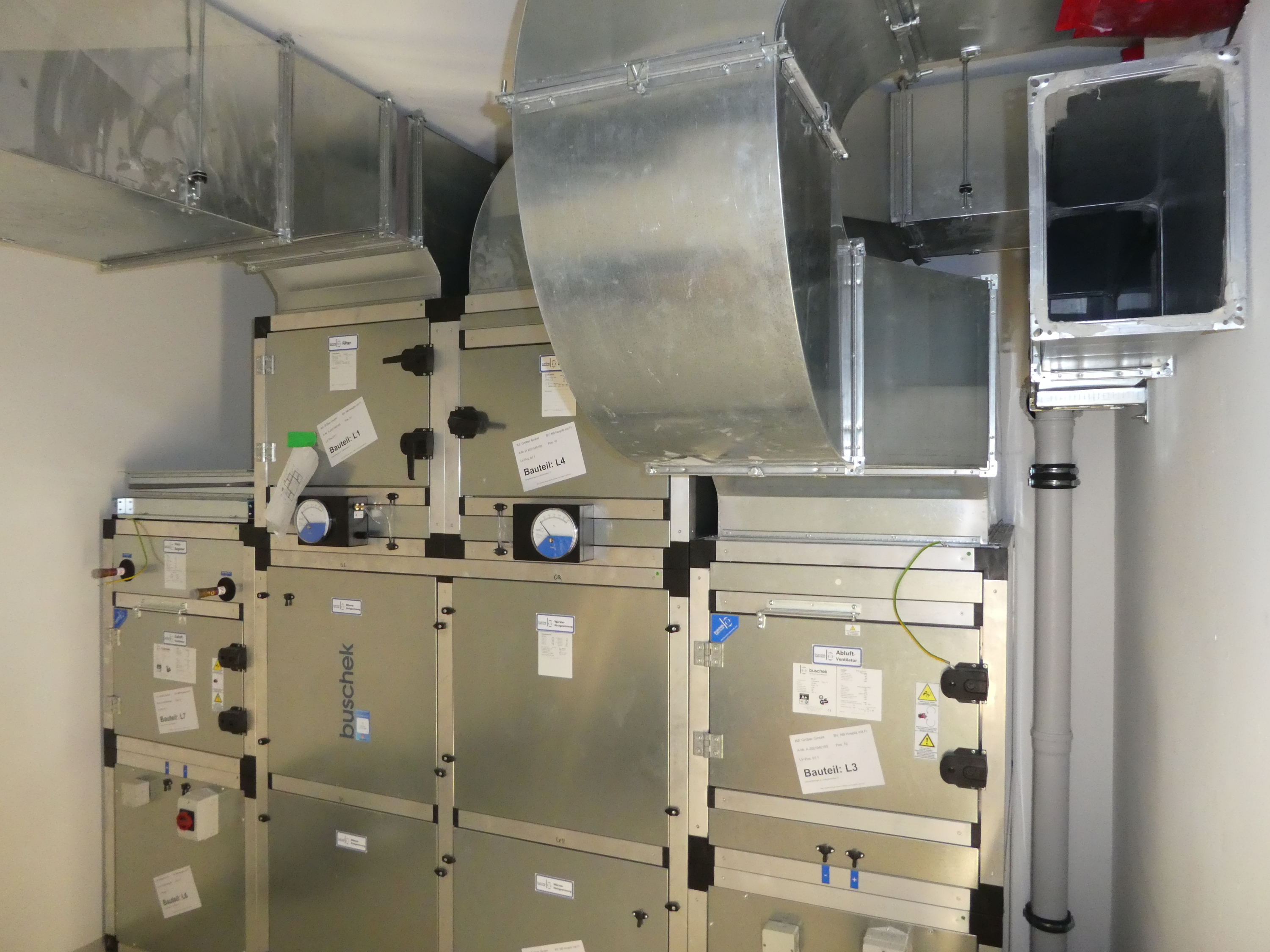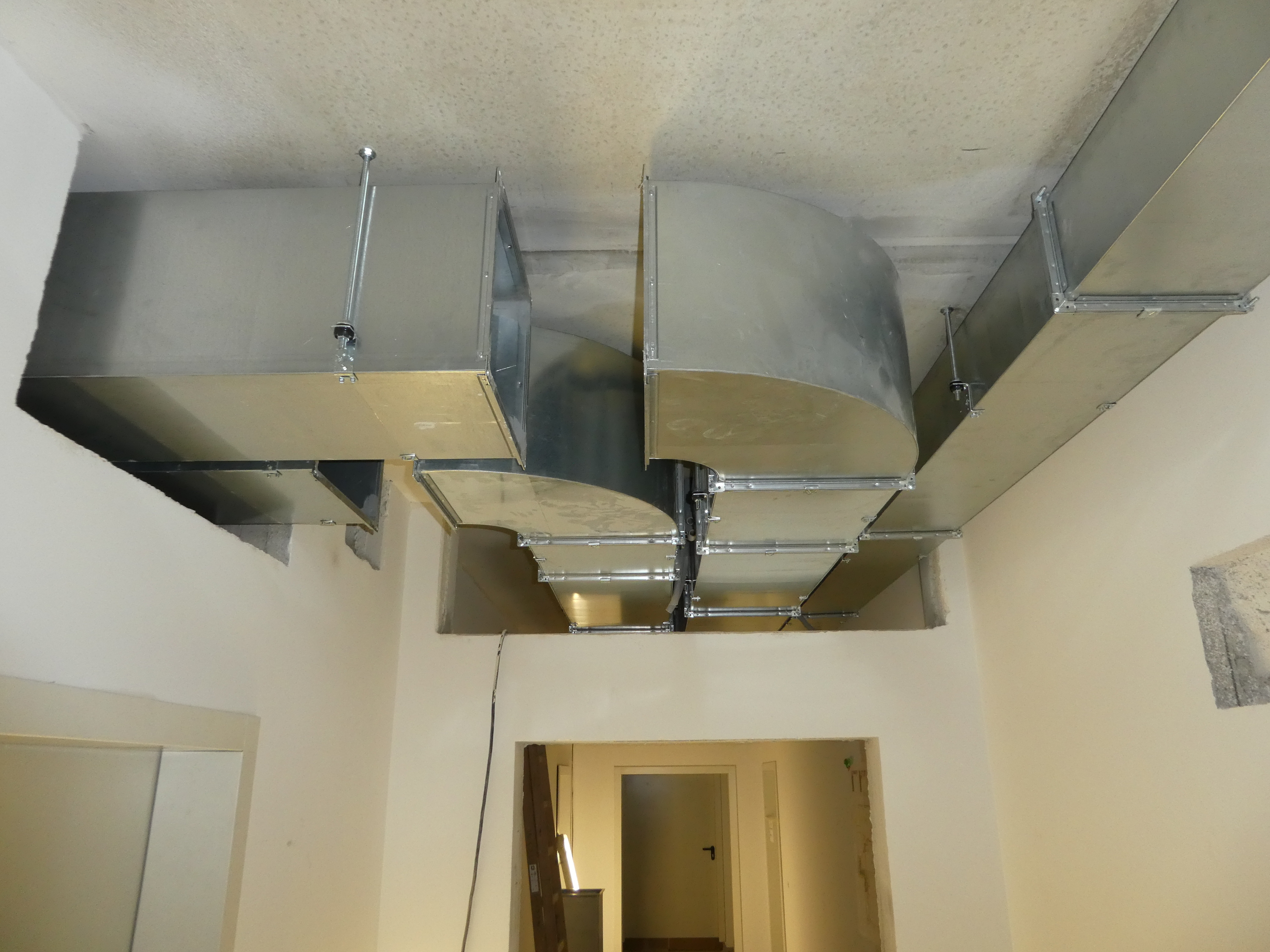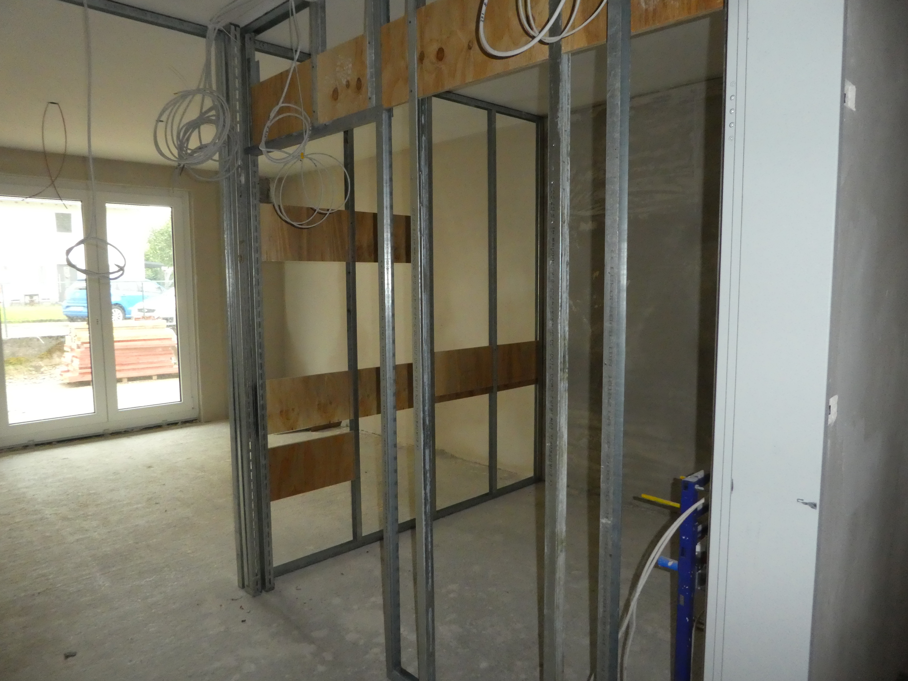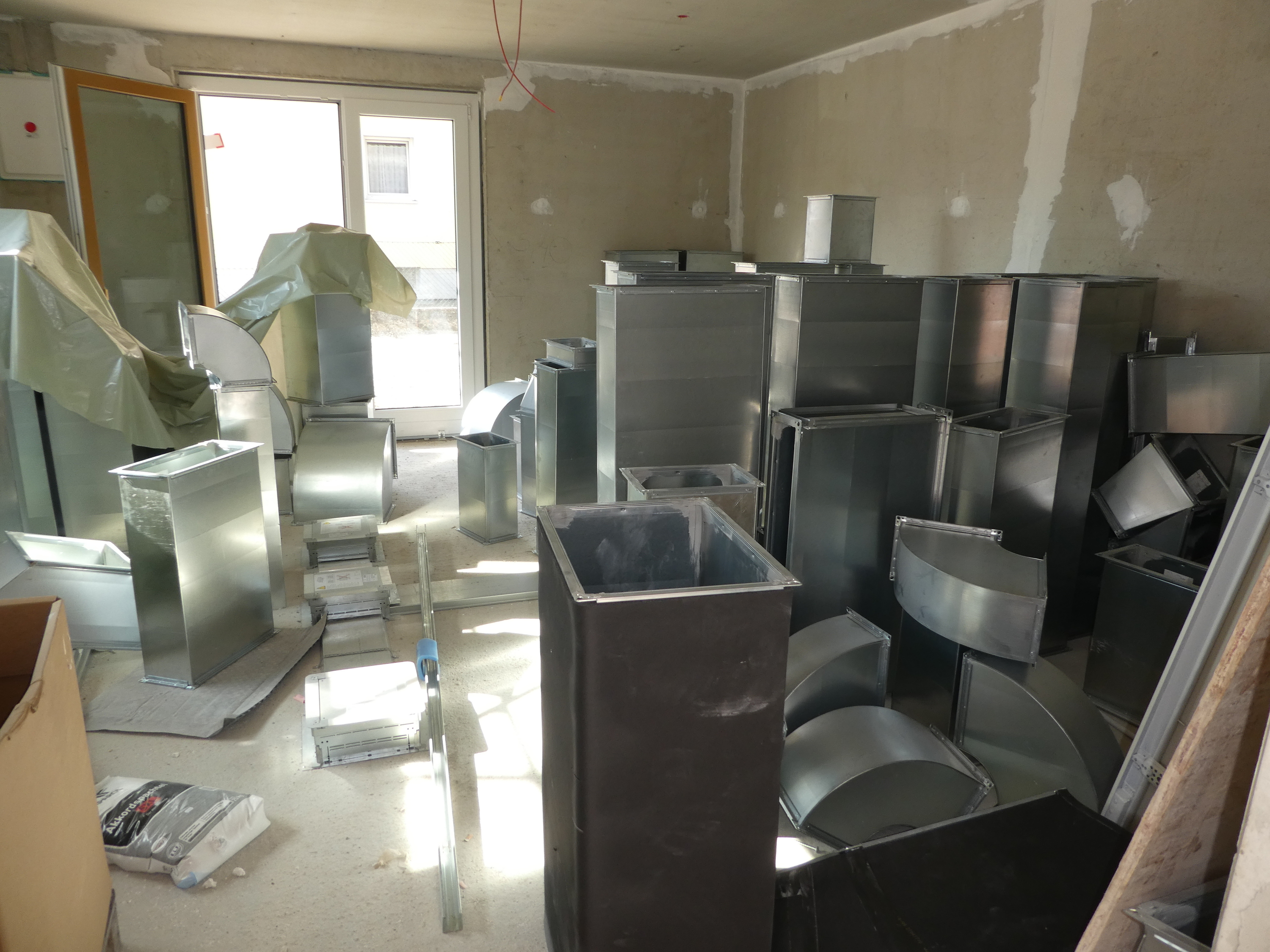 Die Ausbauarbeiten im gesamten Gebäude gehen zügig voran: in allen Etagen wird am Aufbau der Bäder gearbeitet, die Trockenbauwände sind schon fast alle zumindest einseitig beplankt, im ganzen Haus finden sich fertig eingebaute Türen, an anderer Stelle stehen die Türstöcke schon zum Einbau bereit. Auch die Lüftungskanäle werden, im Erdgeschoss beginnend, nun installiert. Die Hausanschlüsse für die drei betriebsnotwendigen Medien Gas, Wasser und Strom sind planmäßig fertiggestellt. Mit der Montage der Fensterelemente für den Veranstaltungsraum und das Büro der Sozialstiftung nähert sich auch der Fensterbau seinem Abschluss: wir erwarten nur noch die Lieferung der Eingangsfront des Foyers, dann sind wir „schlüsselfertig“ – zumindest was die Verschließbarkeit des Hauses betrifft…