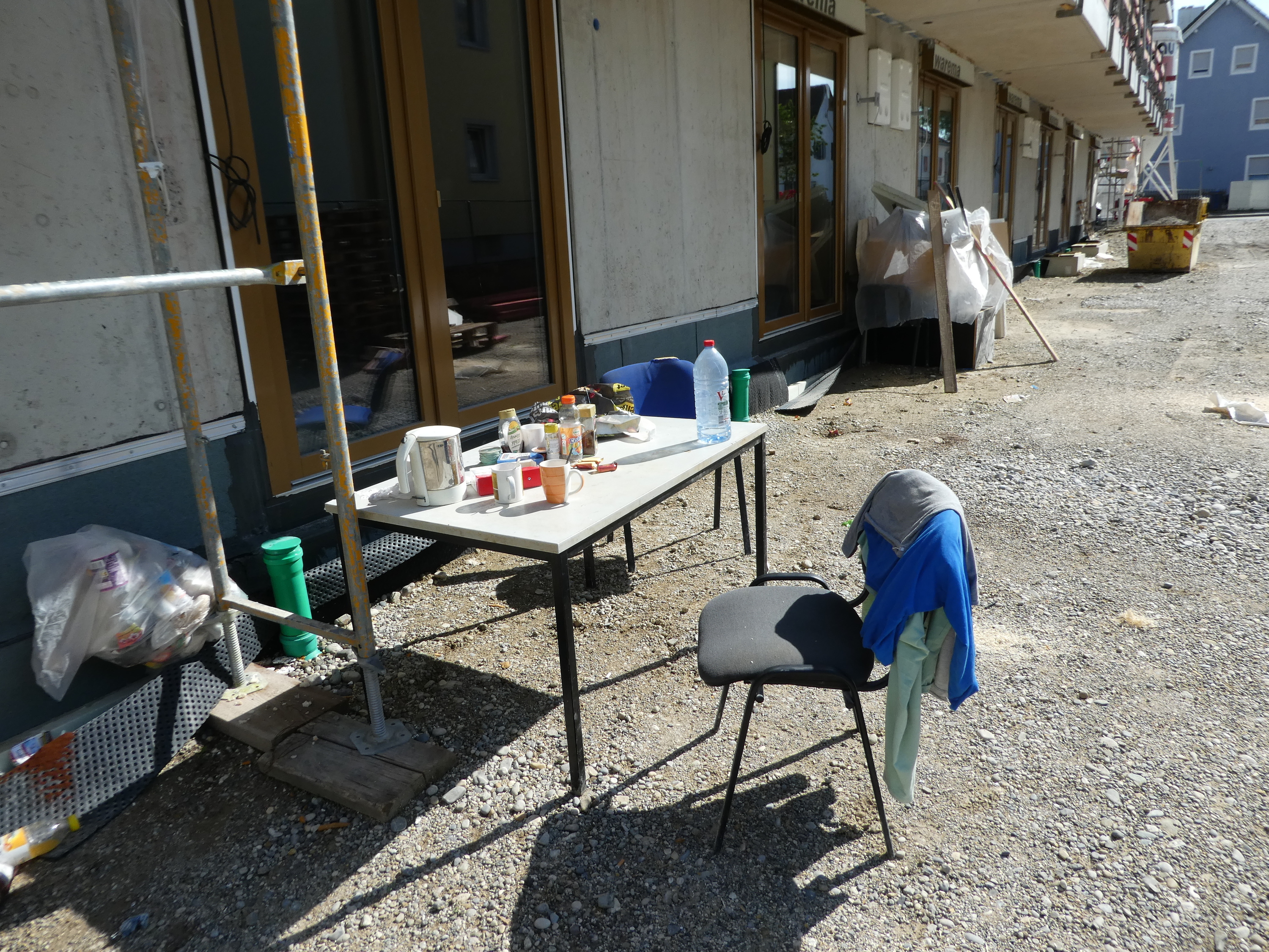 Derweil erweist sich das Hospiz schon als „gastlicher Ort“ für die dort Tätigen – doch die Plätze sind verwaist, weil die Handwerker auch am Samstagmorgen fleißig im Inneren des Hauses arbeiten!