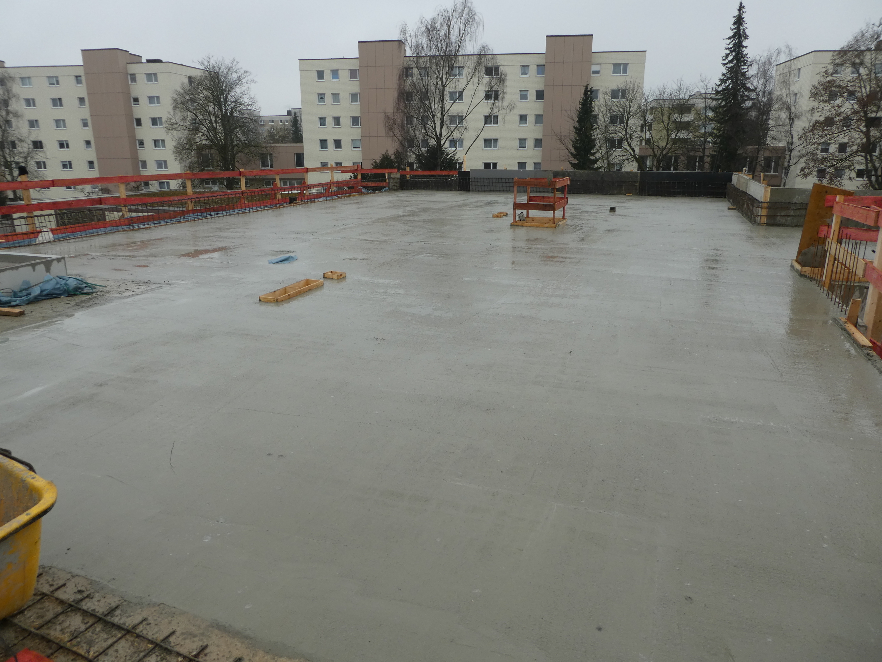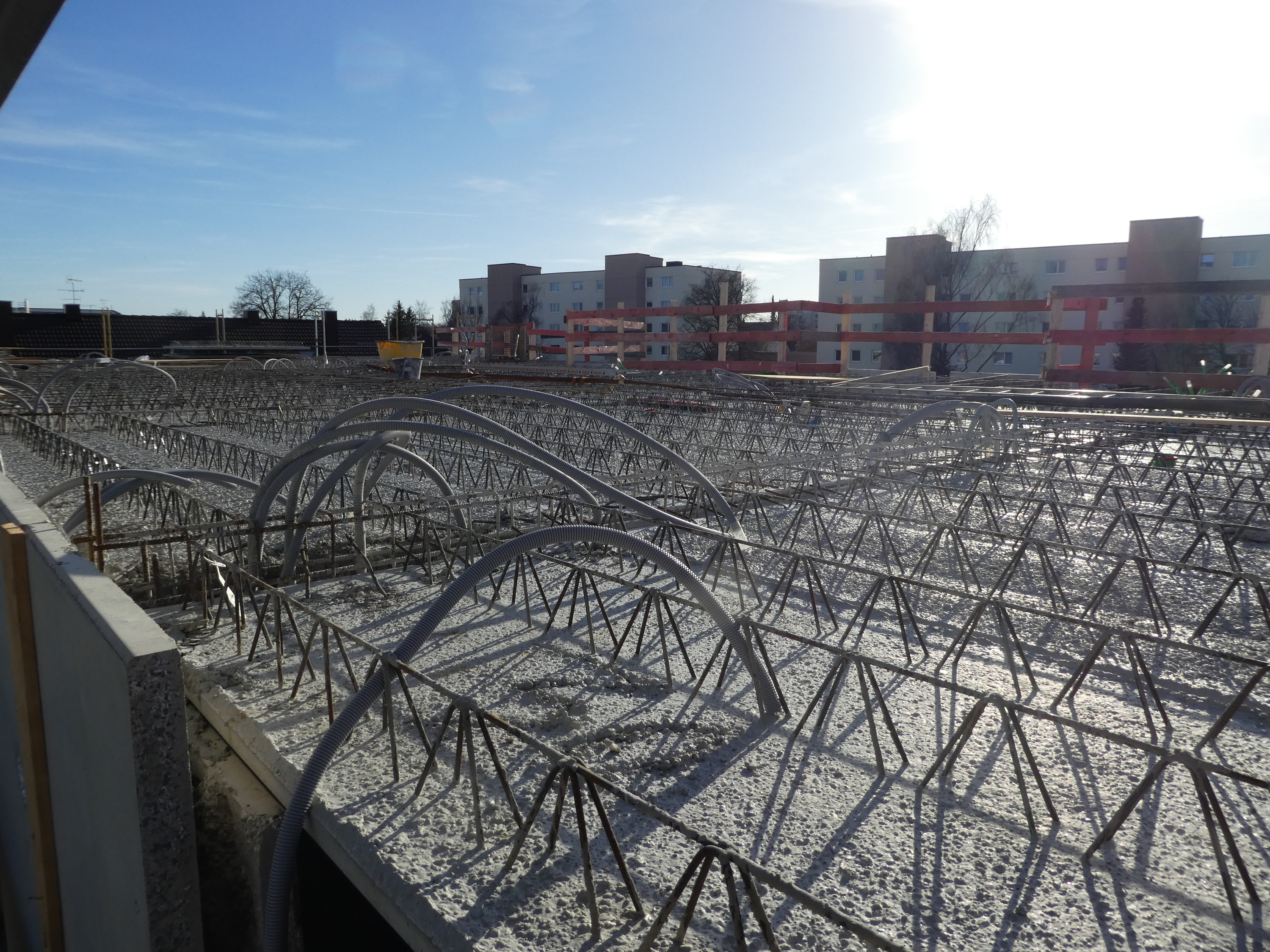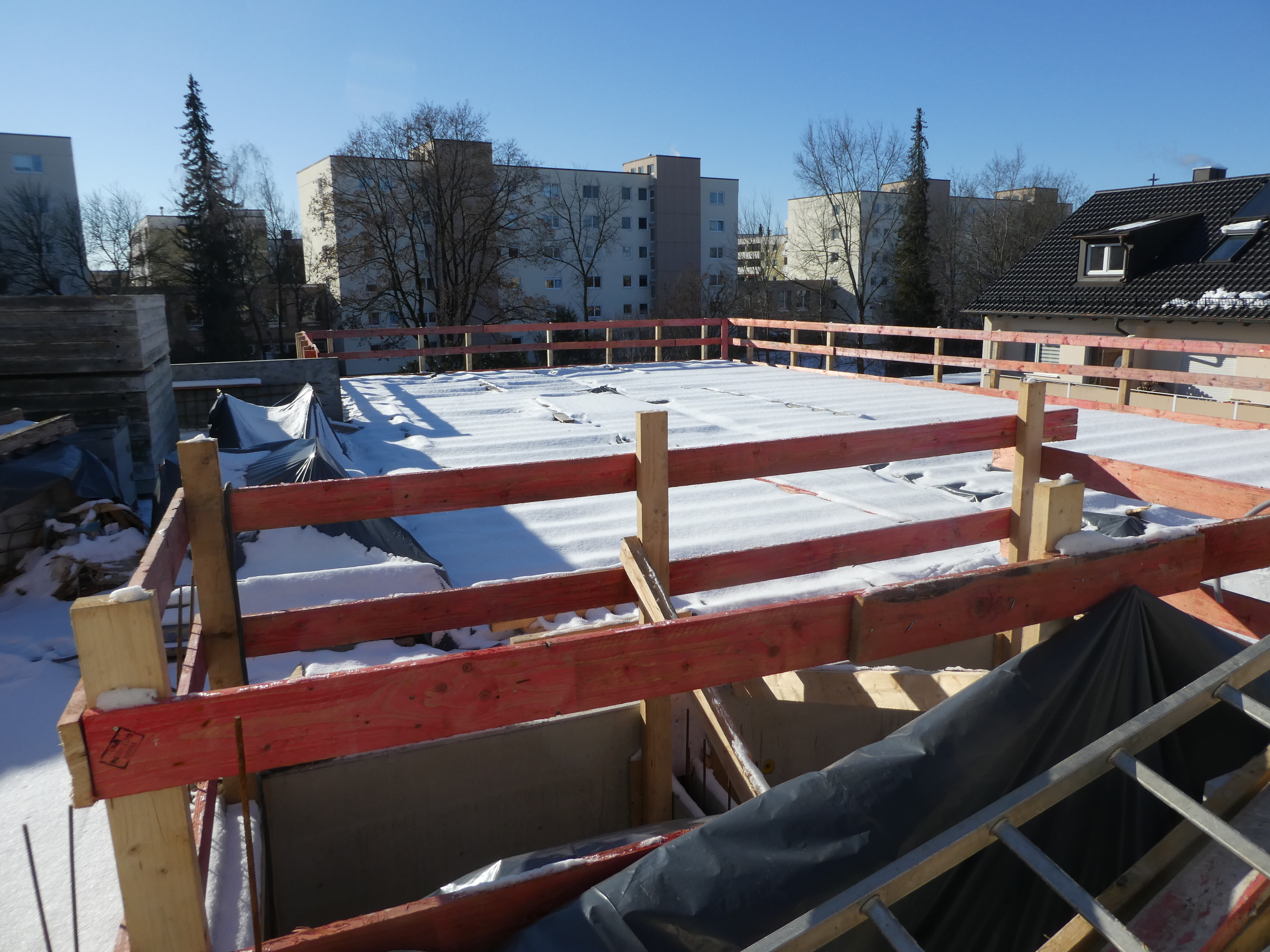 Die Bauwoche war, bedingt durch die große Kälte, nur 3 Tage lang (oder eher kurz…), und doch sind wieder erhebliche Fortschritte erzielt worden: Im Nordflügel ist die Filigrandecke des 1.OG fertiggestellt und zum Betonieren bereit. Im Haupthaus sind im 2.OG ca. 2/3 der tragenden Wände fertiggestellt, die ersten Stützen für die Deckenschalung des 2.OG stehen schon. Es geht also trotz allem vorwärts – und wer Lust zum Schlittschuhfahren hat, könnte in der Tiefgarage seine Runden drehen – dort befindet sich derzeit dank reichlichem Schmelzwasser-Eintrag die vermutliche größte Natureisbahn Germerings! Aber bitte nur nach vorheriger Anmeldung beim Polier und ausgestattet mit Helm, Warnweste und Sicherheits-Schlittschuhen!