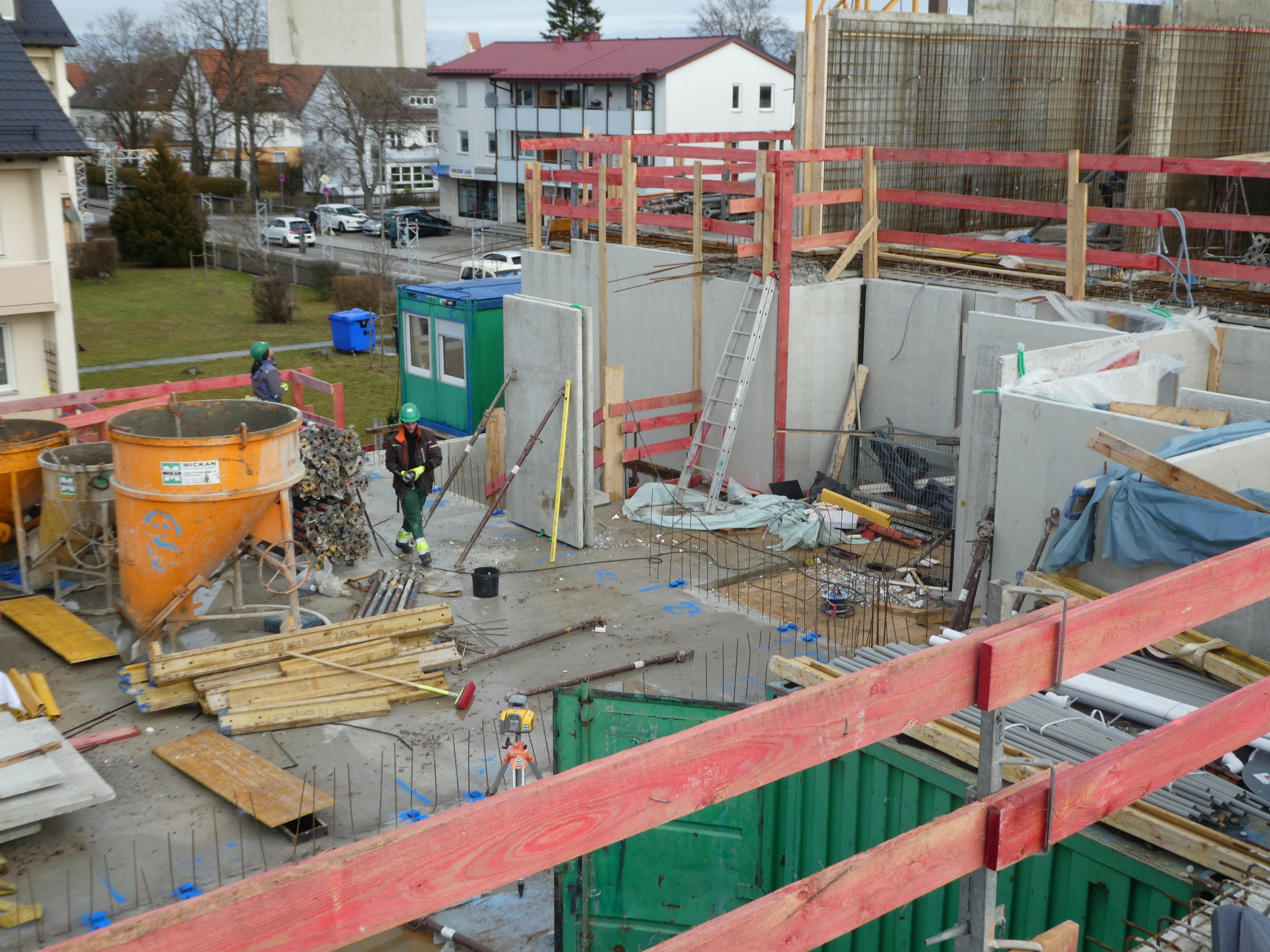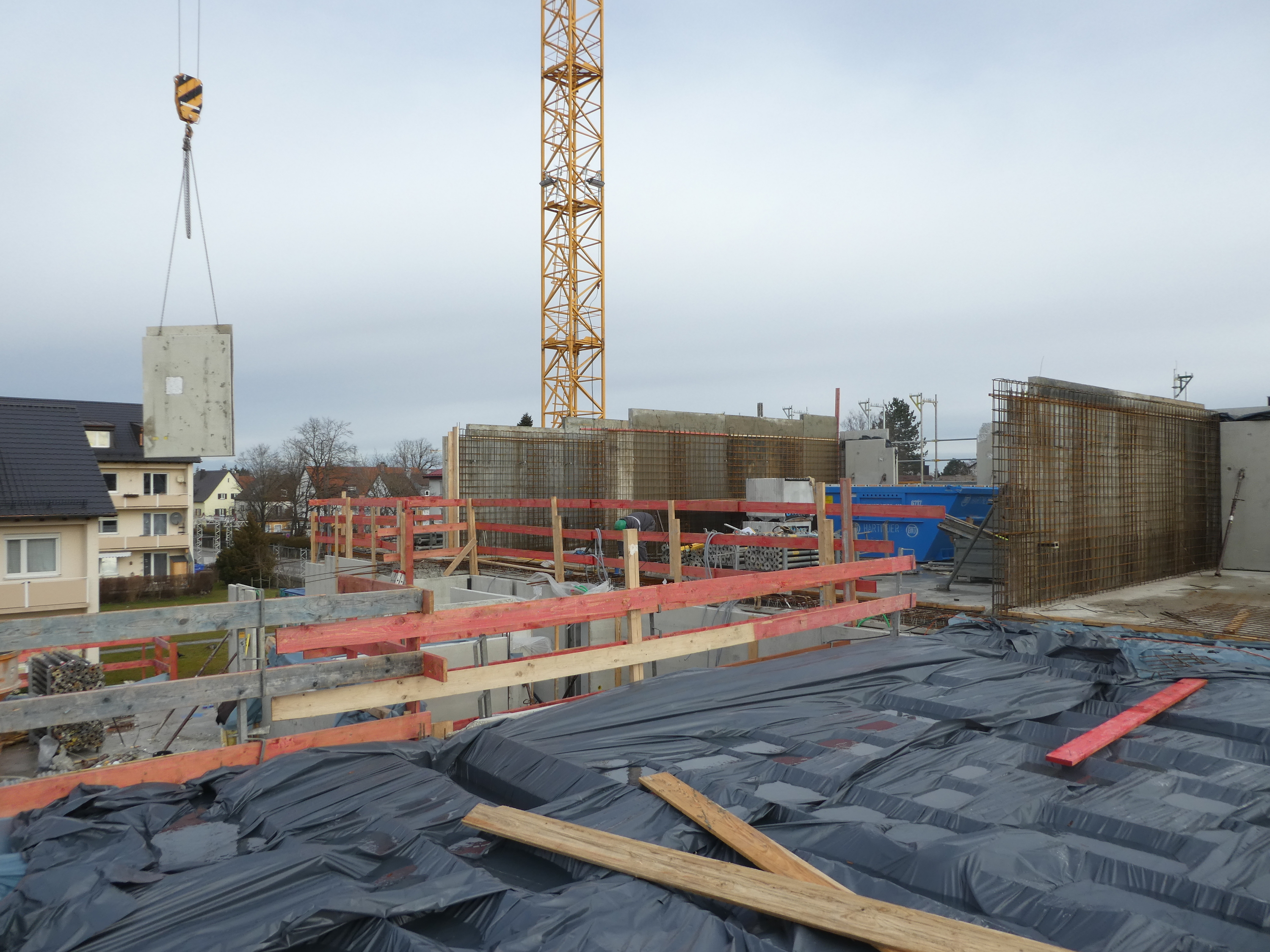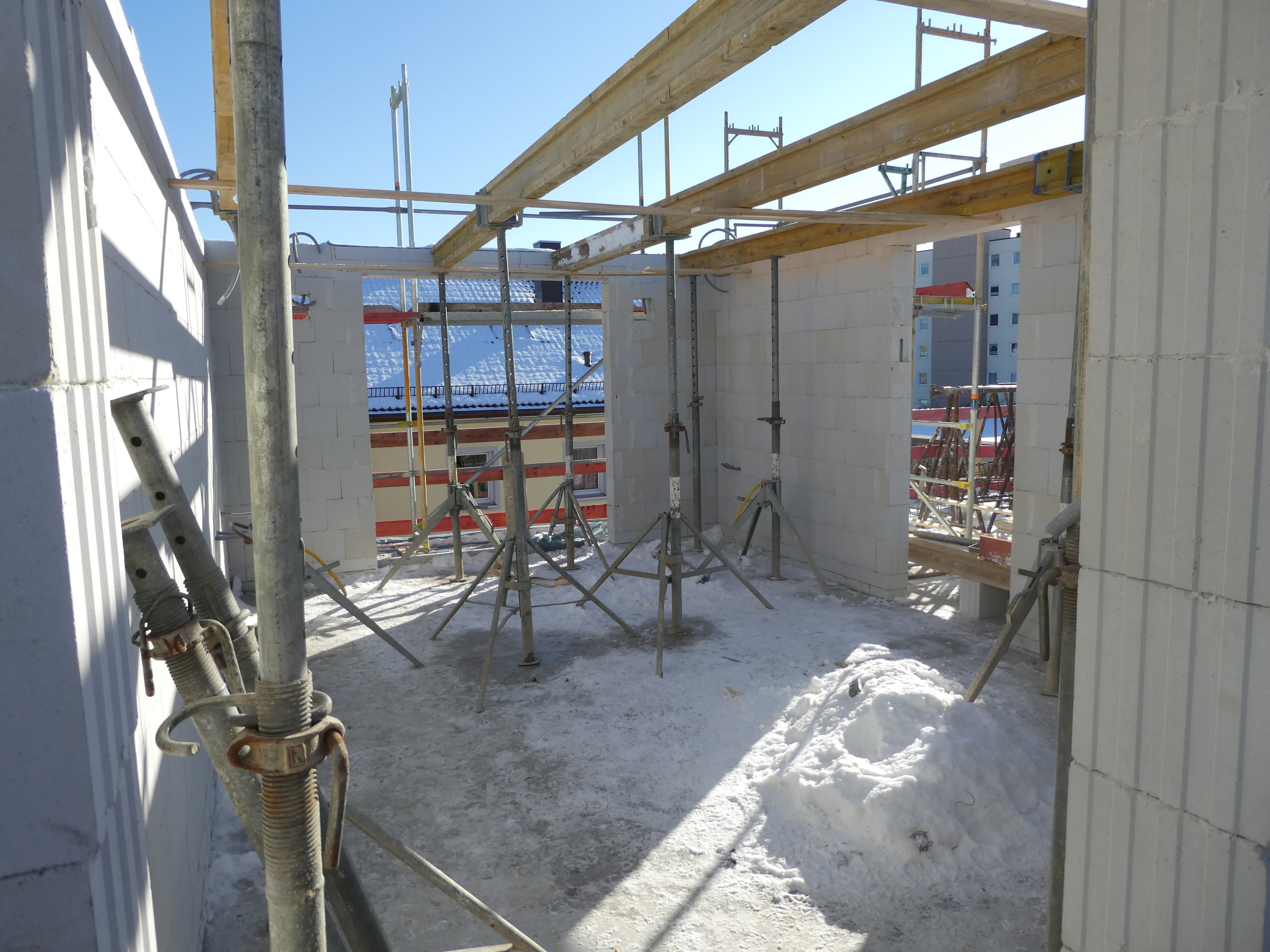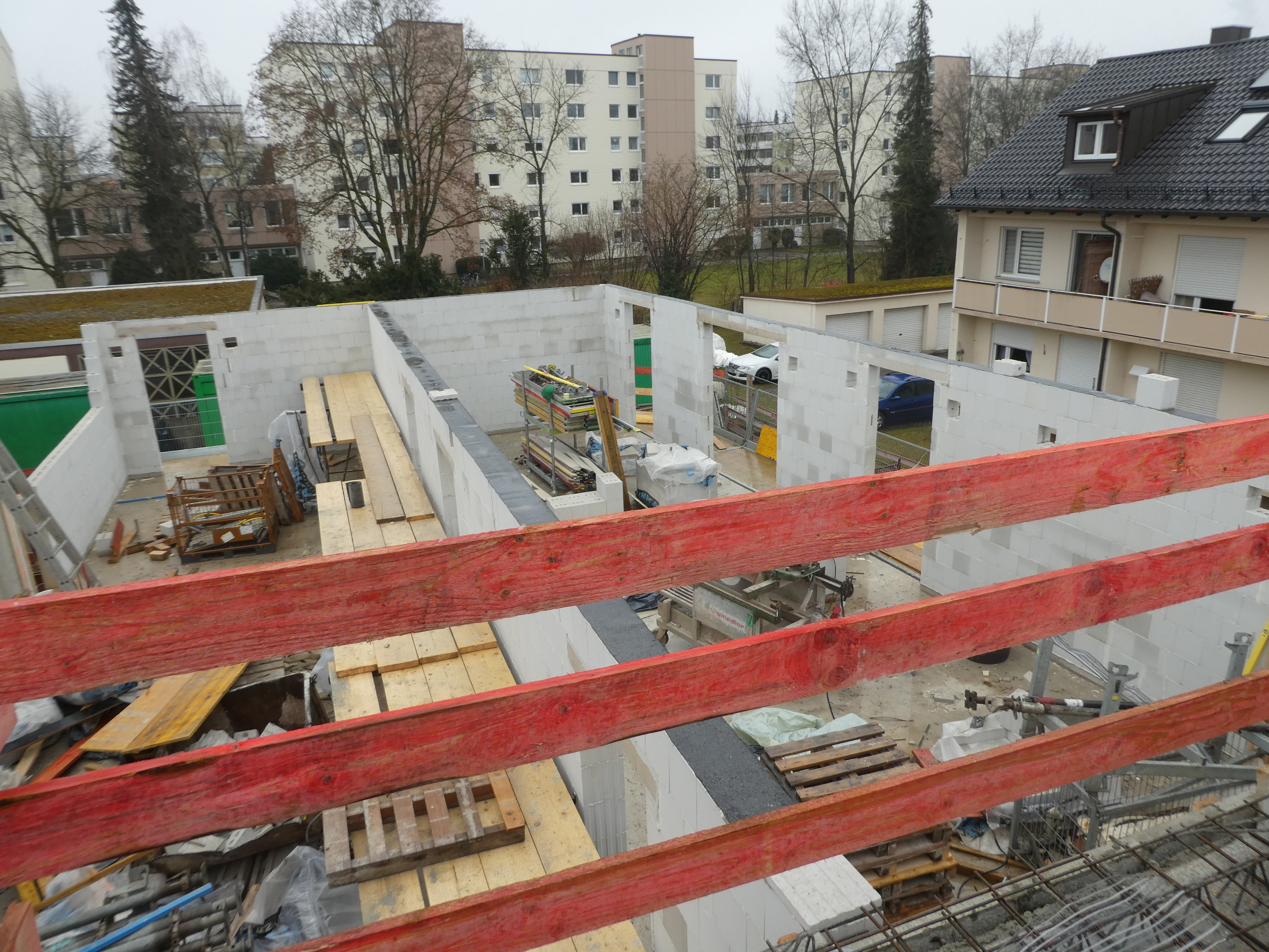 Die Bauwoche war, bedingt durch die große Kälte, nur 3 Tage lang (oder eher kurz…), und doch sind wieder erhebliche Fortschritte erzielt worden: Im Nordflügel ist die Filigrandecke des 1.OG fertiggestellt und zum Betonieren bereit. Im Haupthaus sind im 2.OG ca. 2/3 der tragenden Wände fertiggestellt, die ersten Stützen für die Deckenschalung des 2.OG stehen schon. Es geht also trotz allem vorwärts – und wer Lust zum Schlittschuhfahren hat, könnte in der Tiefgarage seine Runden drehen – dort befindet sich derzeit dank reichlichem Schmelzwasser-Eintrag die vermutliche größte Natureisbahn Germerings! Aber bitte nur nach vorheriger Anmeldung beim Polier und ausgestattet mit Helm, Warnweste und Sicherheits-Schlittschuhen!