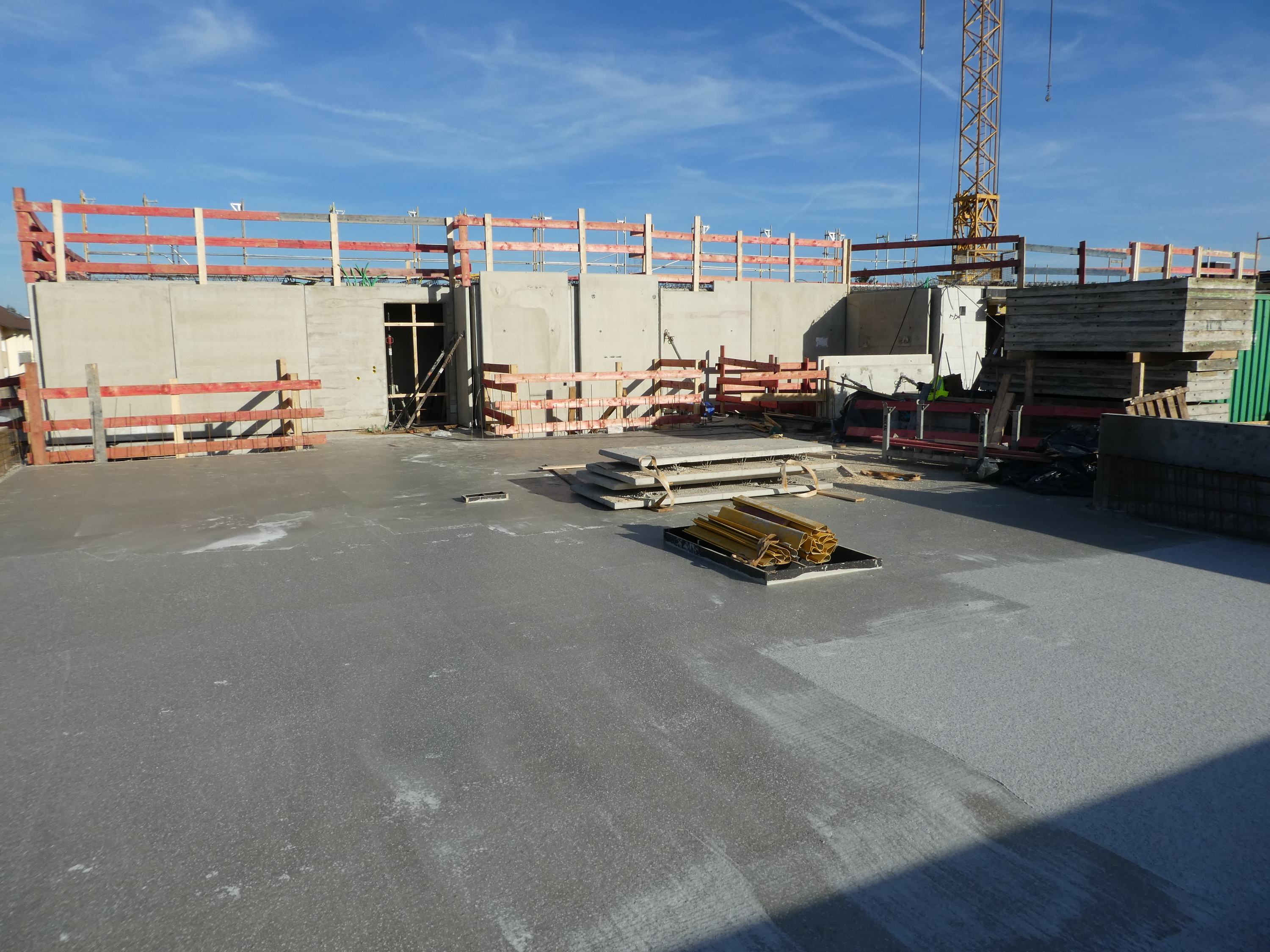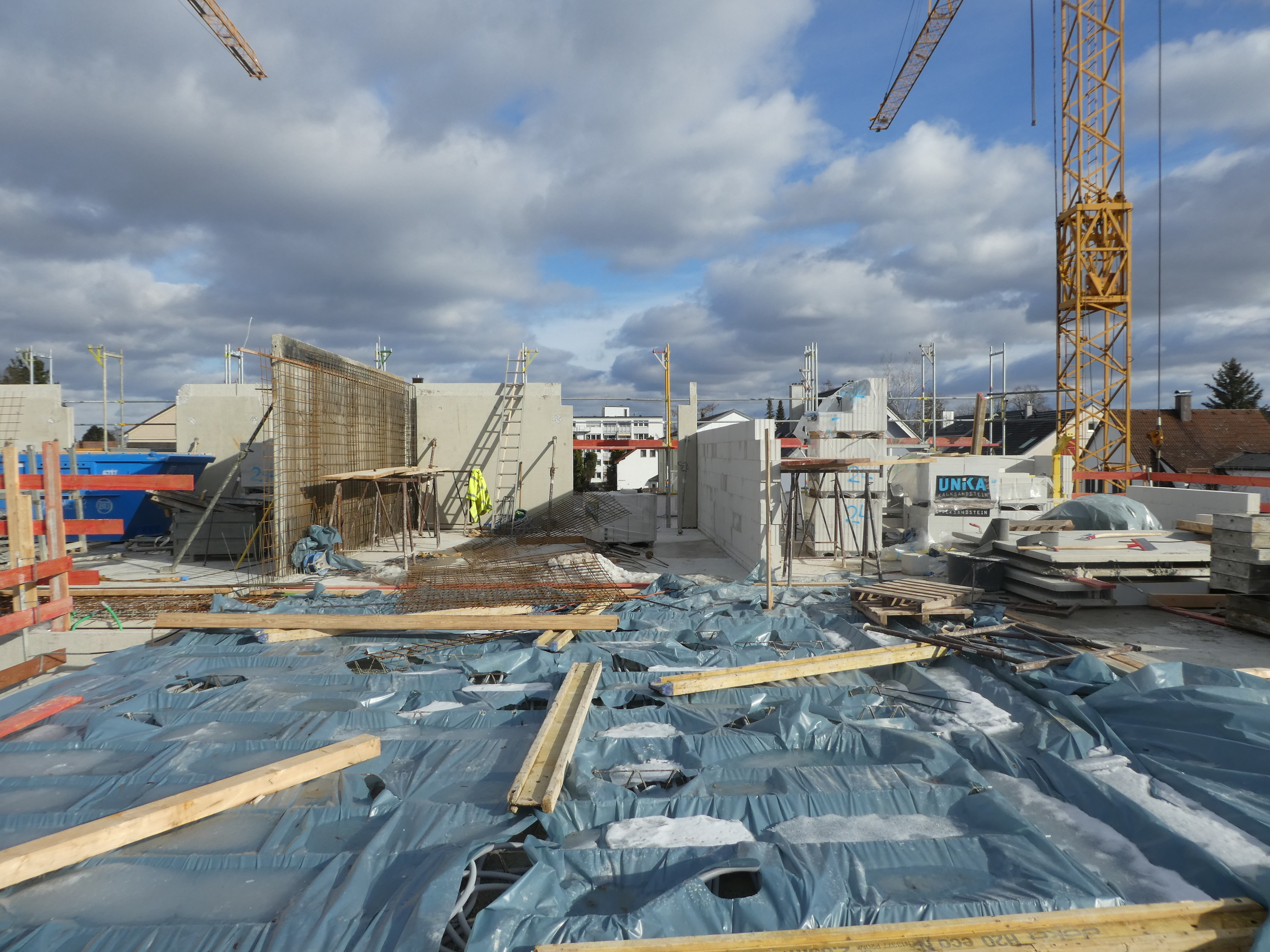 Der Winter ist gewichen, die Natureisbahn in der Tiefgarage ist wieder zum See geworden – und die Decke des 1.Obergeschosses im Nordflügel ist fertig betoniert! Damit ist nun auch das 1.Obergeschoss in allen drei Bauteilen komplett fertiggestellt. Im Süd- und im Nordflügel fehlt jetzt zur Fertigstellung des Rohbaus nur noch die Attika – die Schalungsarbeiten dafür haben schon begonnen. Im Haupthaus sind die tragenden Wände des 2.Obergeschosses fertiggestellt und die Filigrandecke ist aufgelegt. Wenn das Wetter so frühlingshaft bleibt, werden wir nächste Woche die Fertigstellung des 2.Obergeschosses erleben – dann fehlt nur noch das 3.Obergeschoss zur Fertigstellung des Rohbaus.