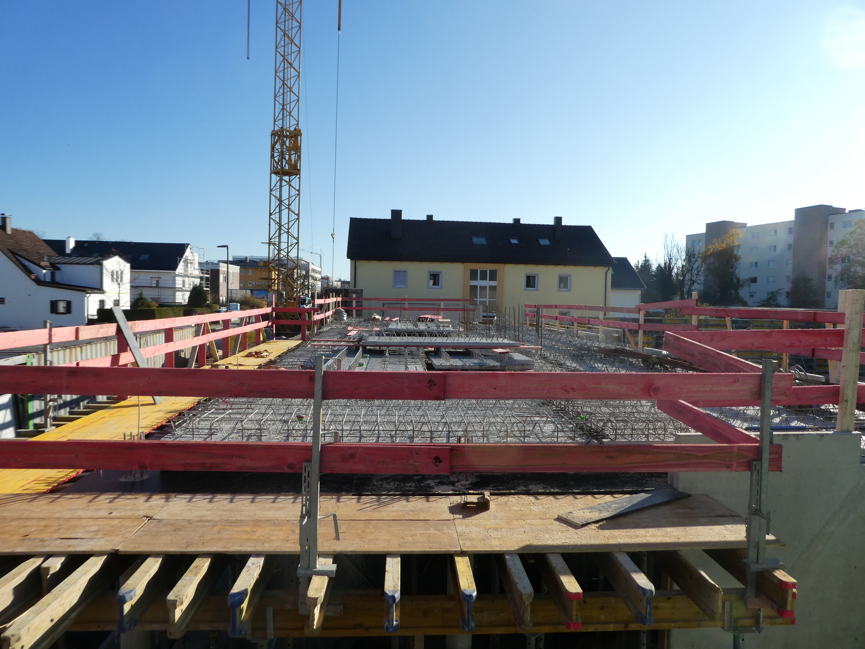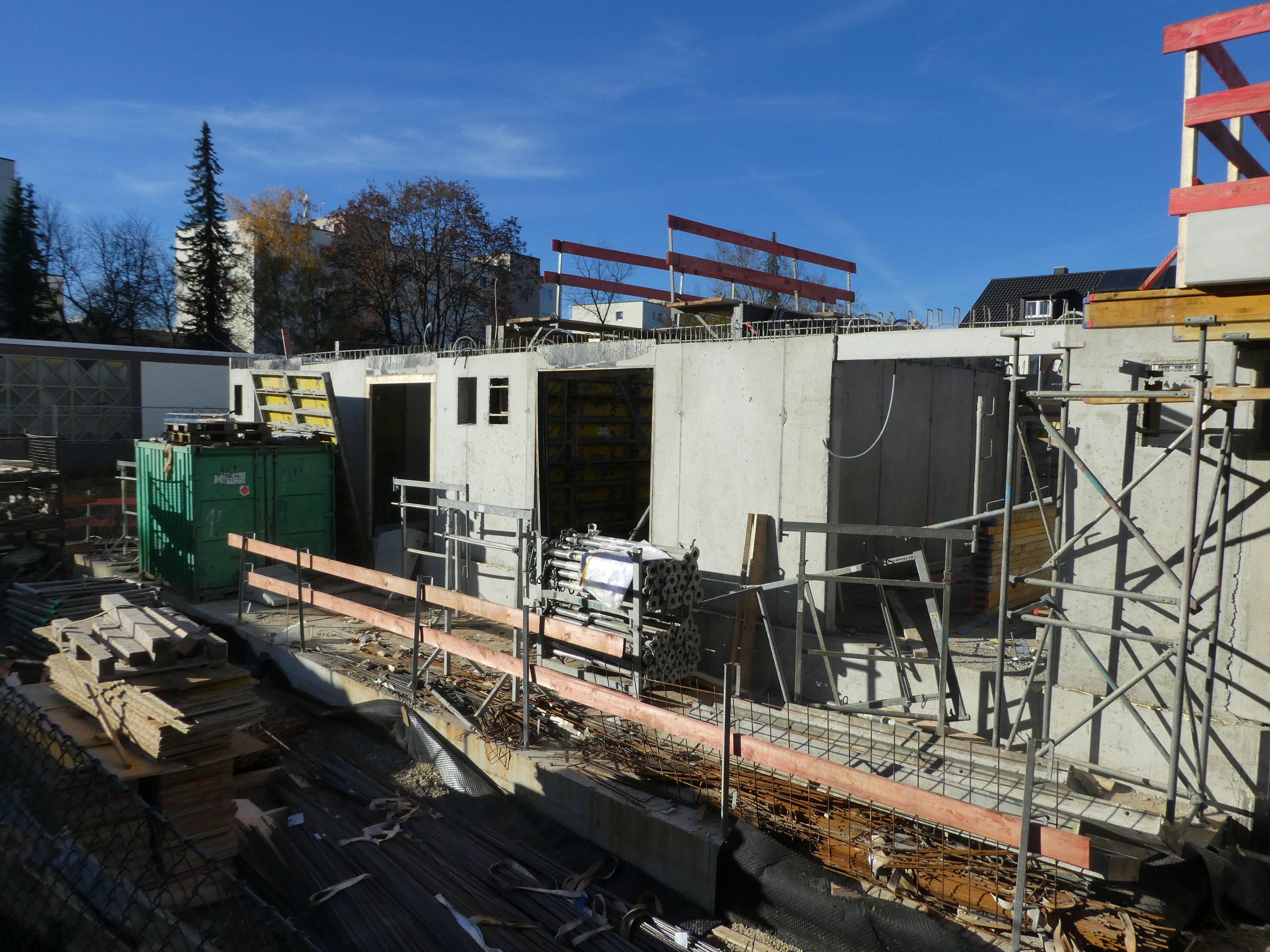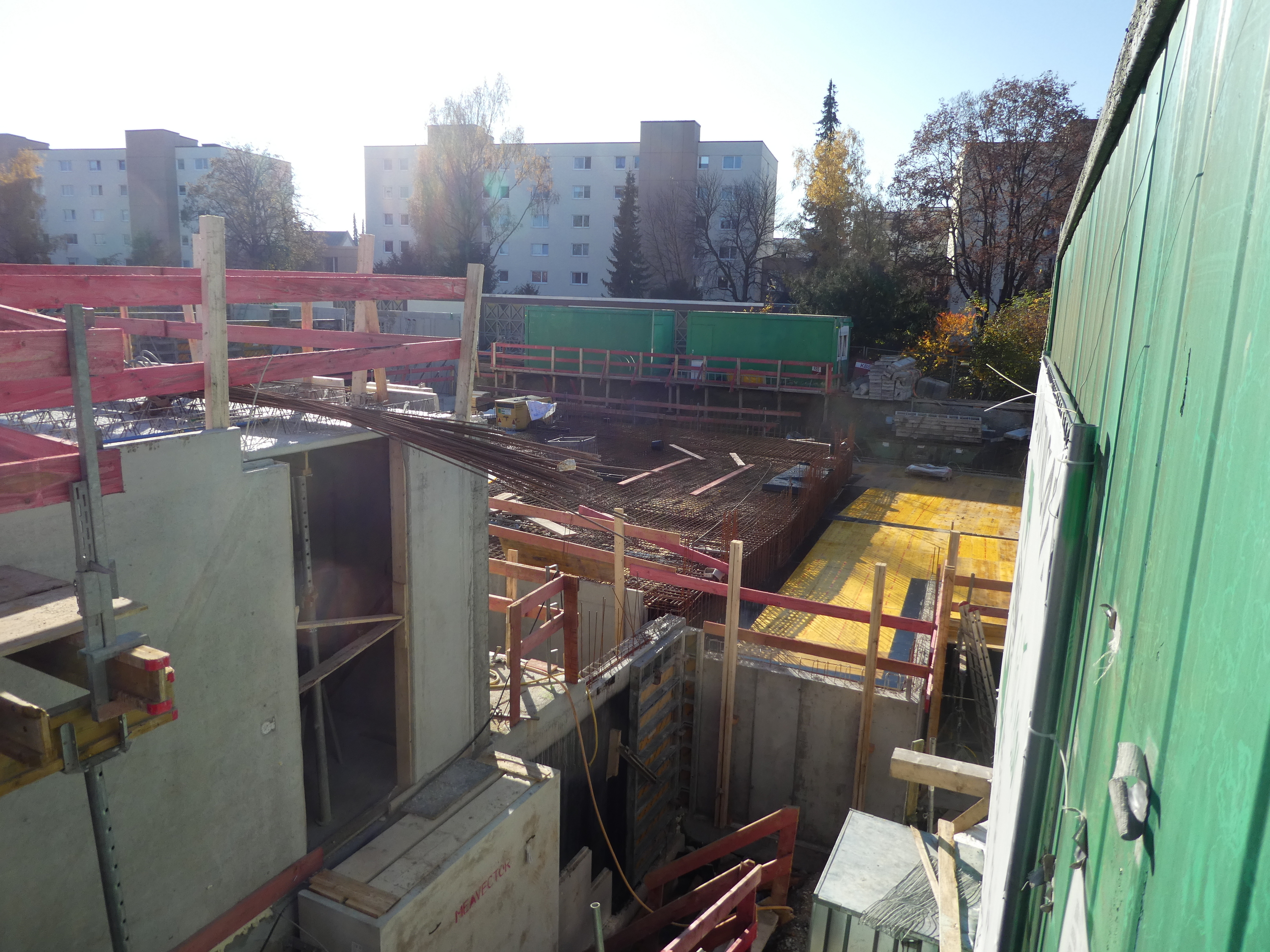 Der zweite Kran hat leider aufgrund eines Motorschadens erst Ende der 45.KW seinen Betrieb aufnehmen können – aber trotzdem ist der Bau wieder sichtbar gewachsen! Im Haupthaus ist die Erdgeschoßdecke aus Filigranteilen eingehängt und mit Spindelstützen abgestützt – somit kann die Decke demnächst betoniert werden. Im Südflügel stehen die Schalungen für die Erdgeschoß-Südwand und - Westwand. Etwas weniger weit fortgeschritten ist der Nordflügel: hier ist erst die Armierung der Kellerdecke fertiggestellt, die Decke kann jetzt betoniert werden. In der nordwestlichen Ecke der Tiefgarage steht die Deckenschalung, die Armierung muss noch erstellt werden.
