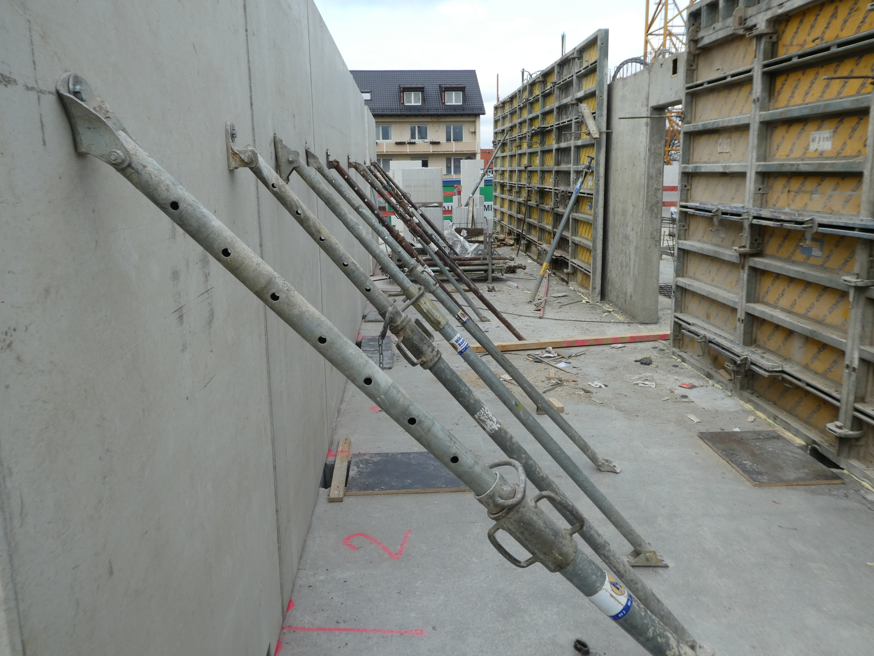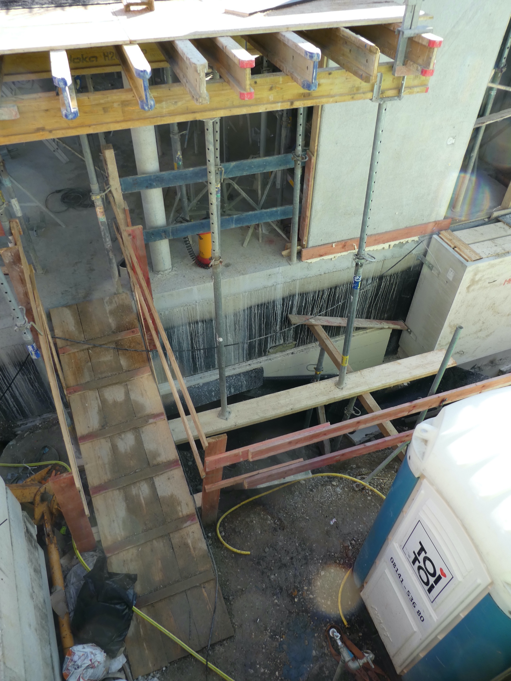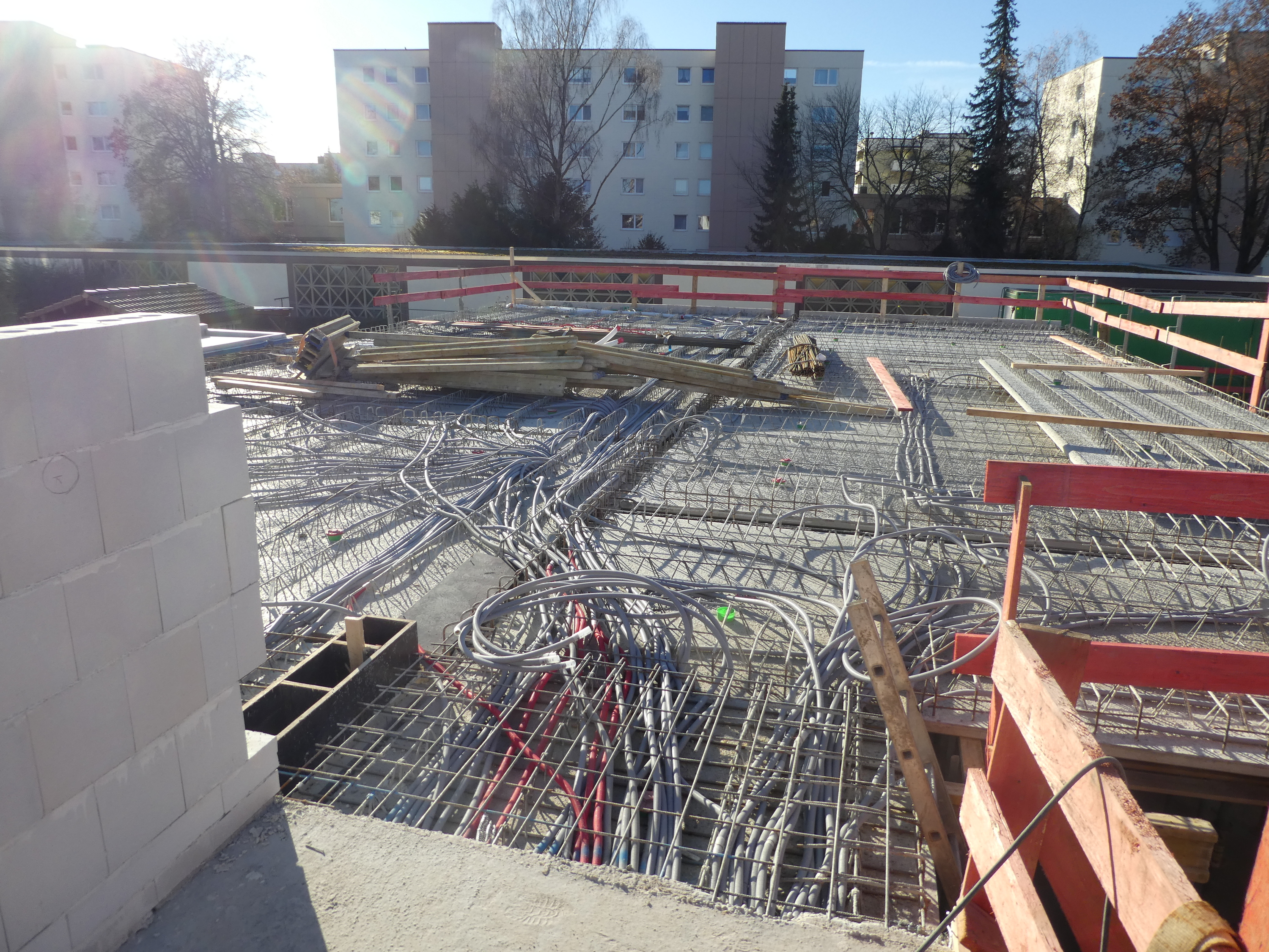 Der zweite Kran hat leider aufgrund eines Motorschadens erst Ende der 45.KW seinen Betrieb aufnehmen können – aber trotzdem ist der Bau wieder sichtbar gewachsen! Im Haupthaus ist die Erdgeschoßdecke aus Filigranteilen eingehängt und mit Spindelstützen abgestützt – somit kann die Decke demnächst betoniert werden. Im Südflügel stehen die Schalungen für die Erdgeschoß-Südwand und - Westwand. Etwas weniger weit fortgeschritten ist der Nordflügel: hier ist erst die Armierung der Kellerdecke fertiggestellt, die Decke kann jetzt betoniert werden. In der nordwestlichen Ecke der Tiefgarage steht die Deckenschalung, die Armierung muss noch erstellt werden.