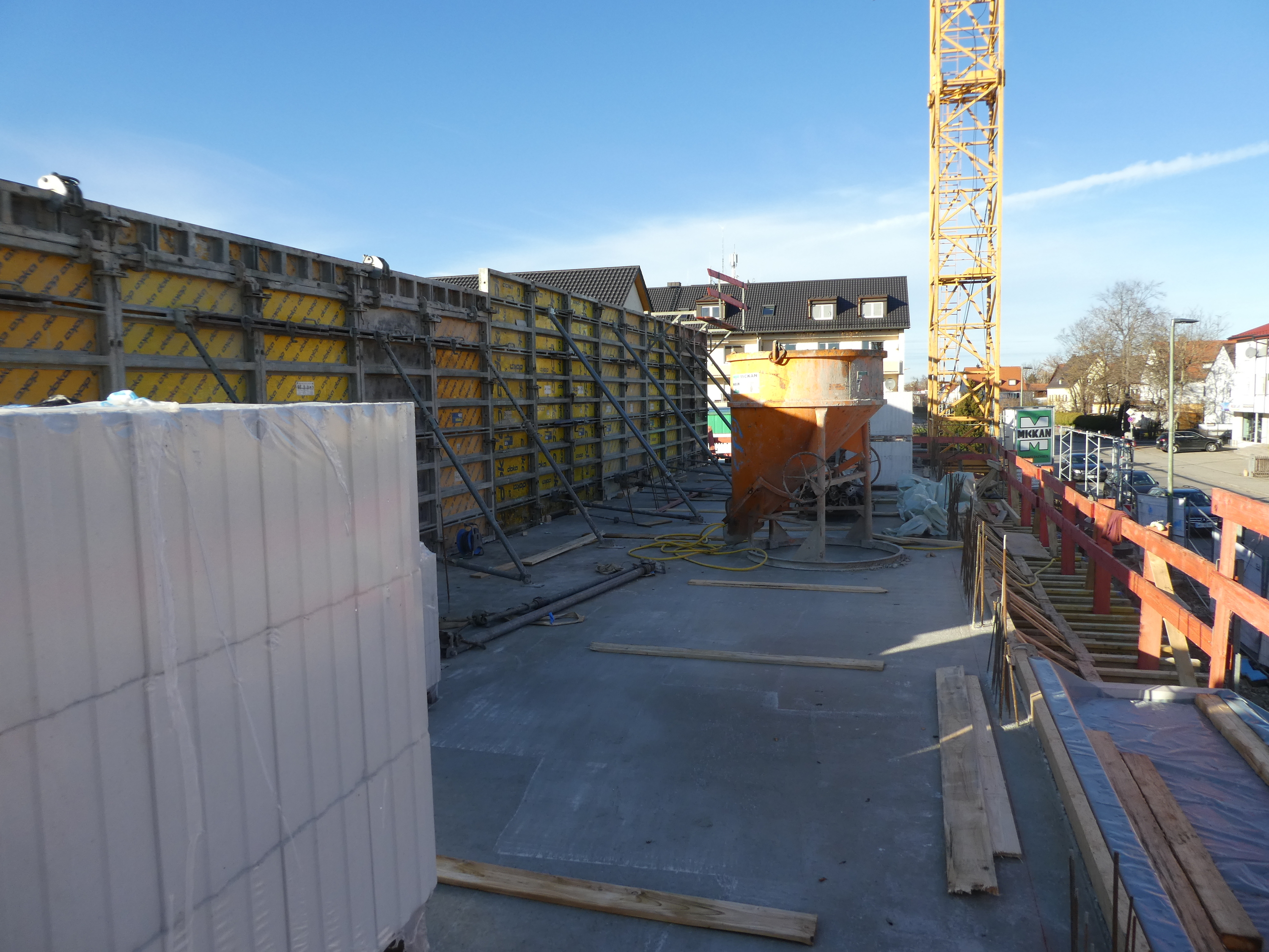 Nachdem im Lauf der Woche der Fundamentgraben aufgefüllt und verdichtet wurde), steht nun endlich ein absolut stabiler Aufstellplatz für den zweiten Kran in der Südost-Ecke des Grundstücks zur Verfügung - der allerdings so knapp bemessen ist, dass zwischen inzwischen aufgestellter Hausecke und Kran gefühlt gerade eine Handbreit Abstand bleibt! Aber immerhin: ab jetzt können zwei Fertigteile gleichzeitig installiert werden, wodurch sich das Bautempo quasi verdoppeln wird (zumindest beim Aufstellen der Wände….). Im Bereich des Haupthauses entlang der Straße ist das Erdgeschoß fast komplett fertiggestellt, die Kellerdecke der Tiefgarage im Bereich des südlichen Seitenflügels ist betoniert. Die Armierungsarbeiten an den noch zu erstellenden Kellerdecken im Mittelteil und im Norden der Tiefgarage sind weiter fortgeschritten – die Fertigstellung der Decken wird demnächst erfolgen.